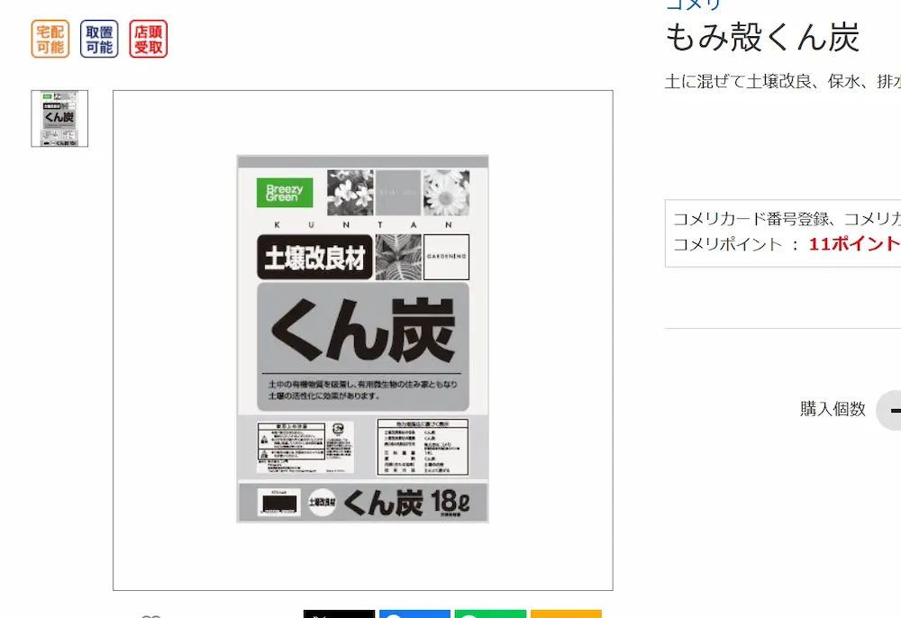 もみがらくん炭は、お米の収穫後に出る「籾殻(もみがら)」を蒸し焼きにして炭化させたもの。軽くて多孔質なのが特徴で、昔から使われ続けてきた環境に優しい土壌改良資材です。ホームセンターの園芸コーナーへ行けば100%売っています。大容量の物を買いたい場合はコメリのオンラインストアで購入するのが安くて良いと思います。BGG計画の芝生で使ったくん炭もコメリのオンラインストアで購入しました。